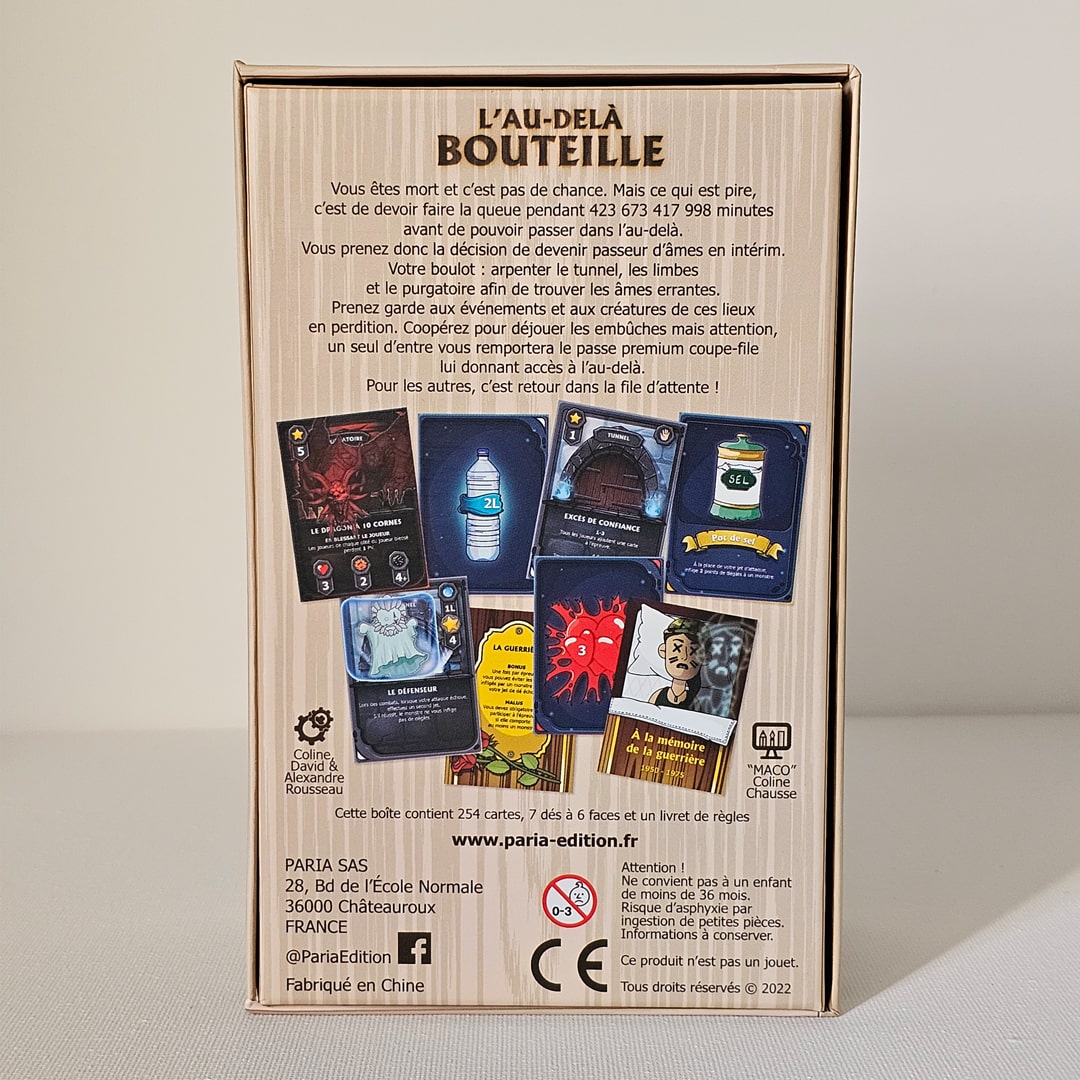 Jeux de cartes semi-coopératif pour 3 à 6 joueurs pour une durée moyenne de 60 minutes, l'Au-delà bouteille vous propulse dans une aventure fantasme, dans un dérouler chaotique où nombreux évènements, et montres vous barrera la route.